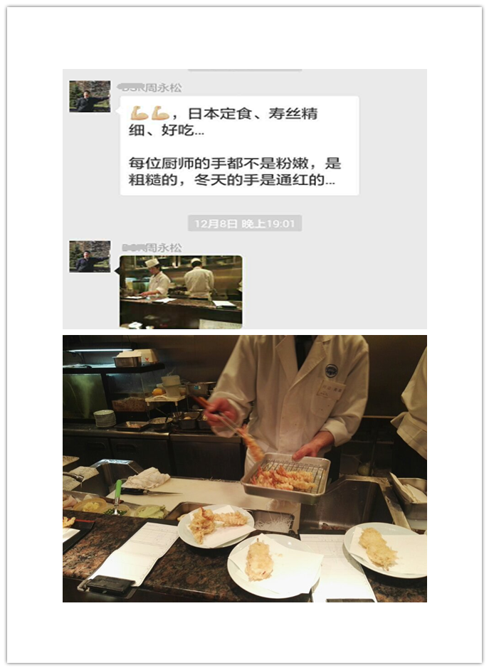 一、 這是一雙粗糙的、冬天里通紅的手??删褪沁@樣一雙手,制作出精致可口的日本壽司、定食。周永松如是在群里和大家分享。